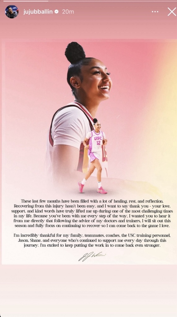 09月29日讯 2027年WNBA状元秀热门人选,NCAA女篮球星,南加州大学王牌朱朱-沃特金斯今日在社交媒体上宣布,自己因伤将缺席整个2025-26赛季。