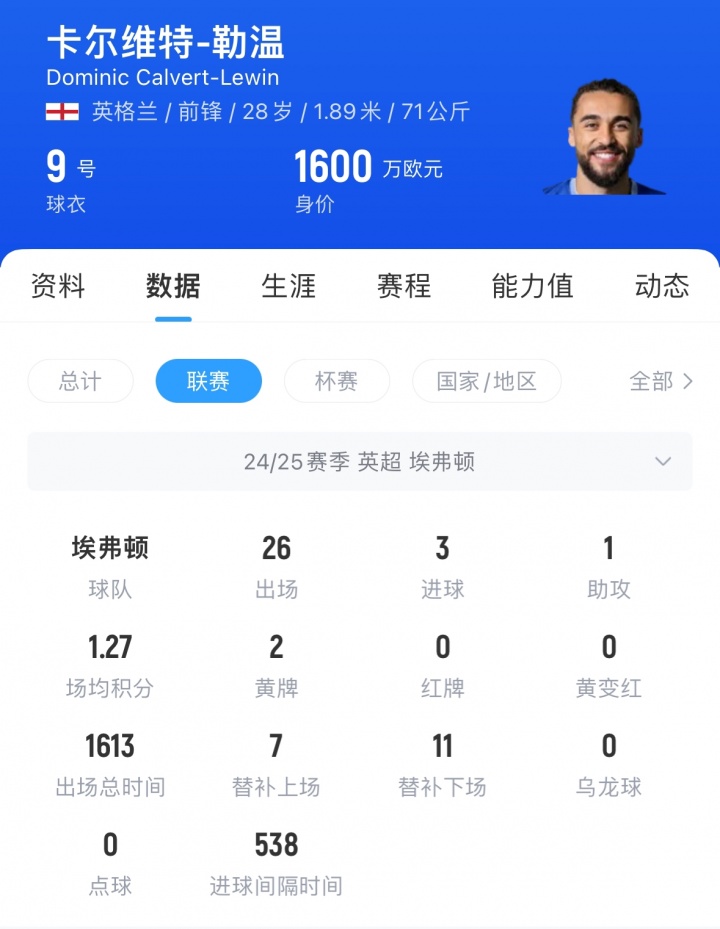 28岁的勒温司职中锋,上赛季为埃弗顿各项赛事26场贡献3球1助攻,已经合同到期自由身离队,当前德转身价1600万欧元。