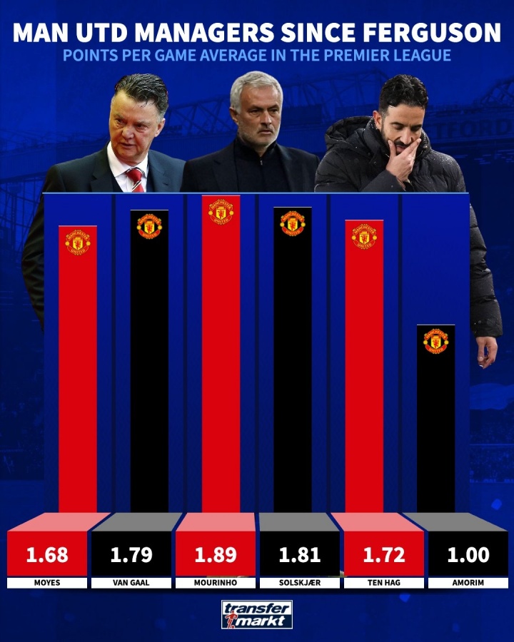 德转统计了在弗格森爵士离任后,曼联几任主教练每场英超比赛平均获得的积分情况,其中穆里尼奥场均1.89分最高,阿莫林则场均1分远落后于几位前任主帅。